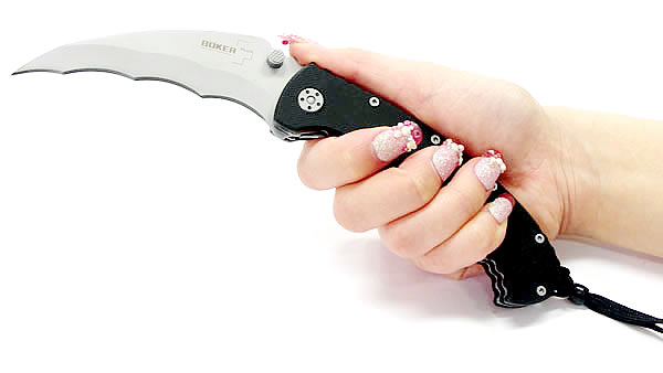 バットマンカランビットです。開くとコウモリに似ています。??ブレードは12C27鋼を使用、錆に非常に強くクロムを13%以上を含みます。特殊なブレード形状で引き切る等、パッケージの開封、固いロープの切断などオールマイティブレードです。ハンドルは滑りにくく、使用感抜群のG10ハンドル仕様。ワンハンドでブレードが起こせる、オープンサポートレバー装備。ナイフアクションをお楽しみ下さい。タクティカルランヤード付・セイフティライナーロック搭載。刃調整は当店でいたしました。全長約210mm