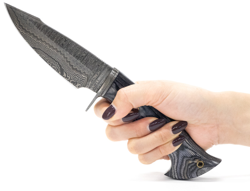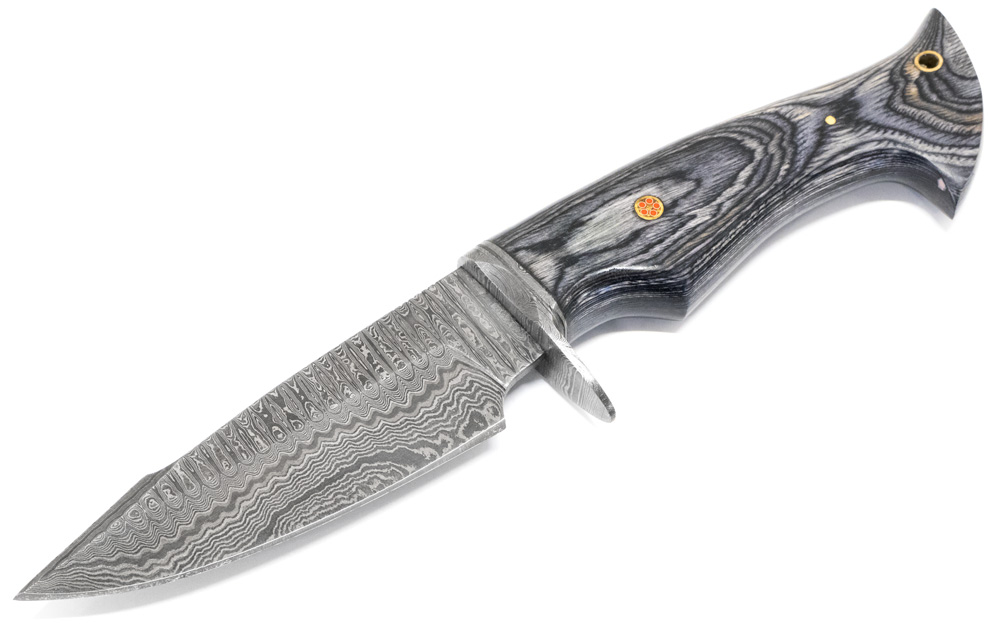 積層ダマスカス鋼で作られたスピアポイントハンティングナイフです。