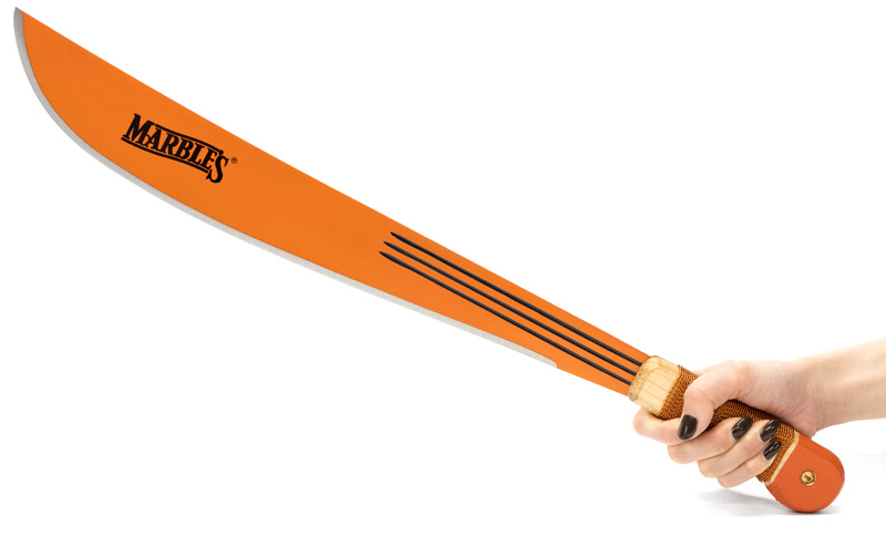 藪などで刃体がレスキューオレンジでよく目立ち、紛失防止にも役立ちます。