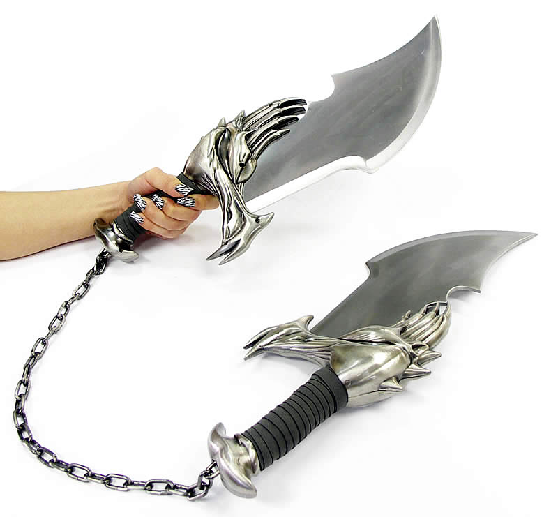 なんと、超大型のナイフが鎖で連結「神の戦い」にふさわしい超々迫力です。全重量2400gは圧巻の迫力です。お部屋のインテリアにいかが 全長約420mm・重さ1本1200g・鎖長460mm・壁飾台付